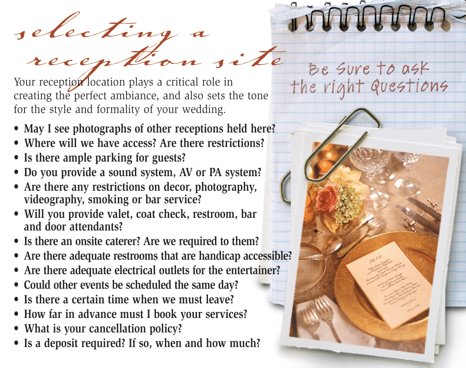 Selecting Reception Site Tips - Courtesy of The Northern Nevada Bridal Association.
